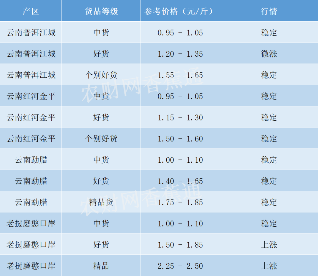 云南红河金平市场香蕉好货1.15-1.30元/斤,个别好货1.50-1.60元/斤,中货参考0.95-1.05元/斤,价格稳定。红河金平地区香蕉成交一般,看货定价。 云南勐腊市场香蕉好货主流成交价格1.40-1.65元/斤,较上一交易日价格趋稳。中货1.00-1.10元/斤,部分精品货1.75-1.85元/斤。蕉农卖货积极,客商采购积极性提高,成交以质论价。 老挝磨憨口岸市场香蕉好货成交价格1.50-1.85元/斤,精品2.25-2.50元/斤,中货1.00-1.10元/斤,价格小幅上涨,成交以质论价。看过就
